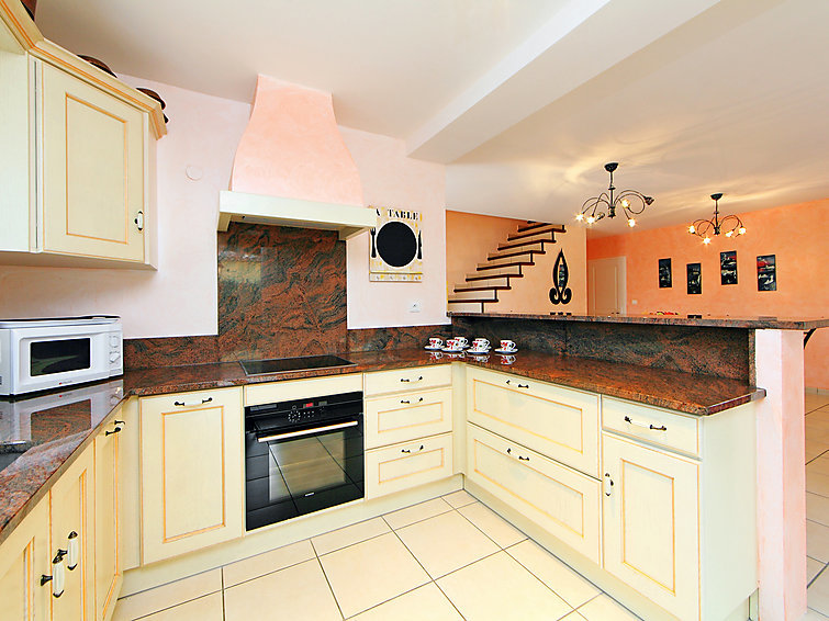 Villa 4-kamers 140 m2 op 2 verdiepingen. Woon-/eetkamer met TV en air-conditioning. 1 kamer met 1 2-pers bed (160 cm, lengte 200 cm). Open keuken (oven, afwasmachine, 4 keramische glas kookplaten, magnetron, diepvriezer, elektrische koffiemachine) met doorgeefluik. Douche, aparte WC. Bovenverdieping: 2 kamers, elke kamer heeft 1 2-pers bed (140 cm, lengte 190 cm). Bad/WC. Elektrische verwarming. Terras overdekt. Terrasmeubelen, barbecue. Ter beschikking: wasmachine, strijkijzer. Internet (Internet (WiFi), extra). Garage, hoogte 185 cm, breedte 350 cm. Rookmelders.