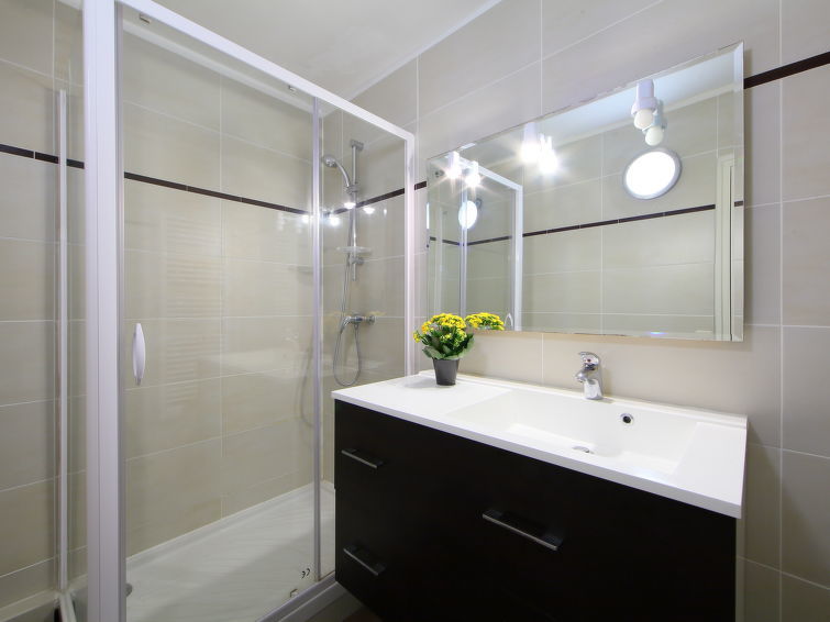 Appartement 1-kamer 37 m2 op de 2e verdieping, op het noordwesten gelegen. Woon-/eetkamer met 1 2-pers divanbed (1 x 140 cm, lengte 190 cm), TV (Flatscreen TV), elektrische rolluiken. Uitgang naar het balkon. Hal met 1 x 2 stapelbedden (90 cm, lengte 190 cm). Kookhoek (afwasmachine, 2 keramische glas kookplaten, broodrooster, waterkoker, magnetron, elektrische koffiemachine). Douche, aparte WC. Elektrische verwarming. Parketvloeren. Balkon 6 m2, op het noordwesten gelegen. Mooi uitzicht op zee. Ter beschikking: haardroger. Internet (WiFi, extra). Garage nr. 44. Rookmelders.
